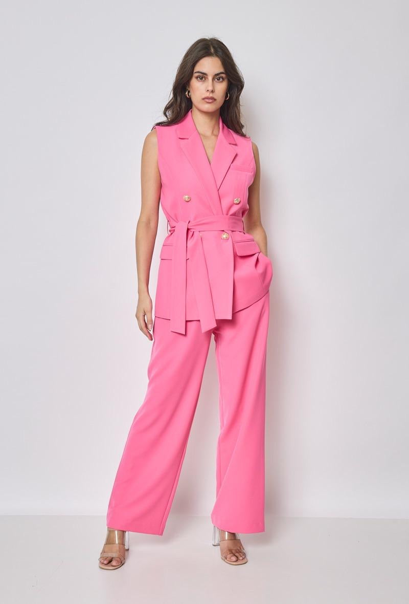Dit prachtige pak in fuchsia tint straalt pure elegantie uit. De double-breasted blazer met gouden...